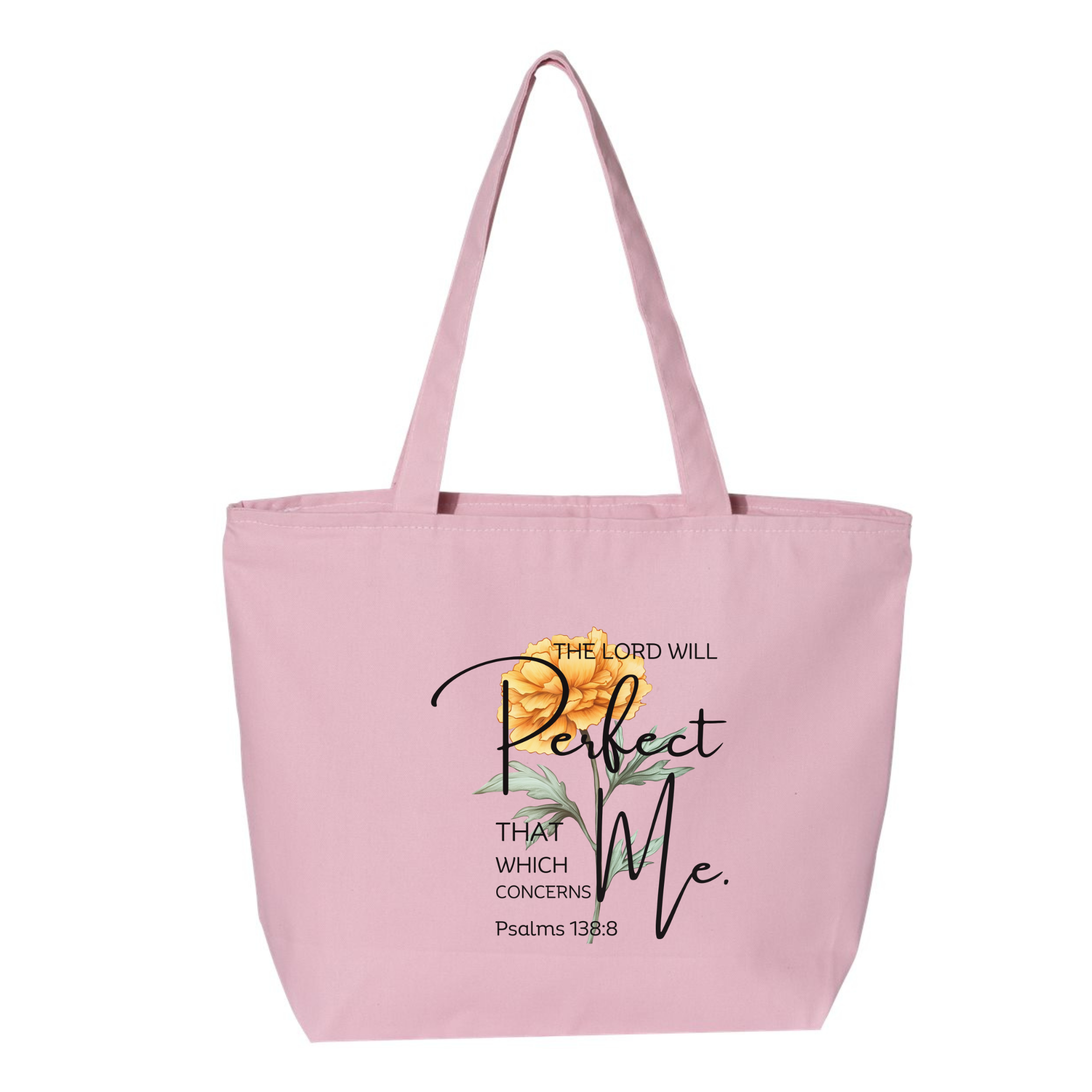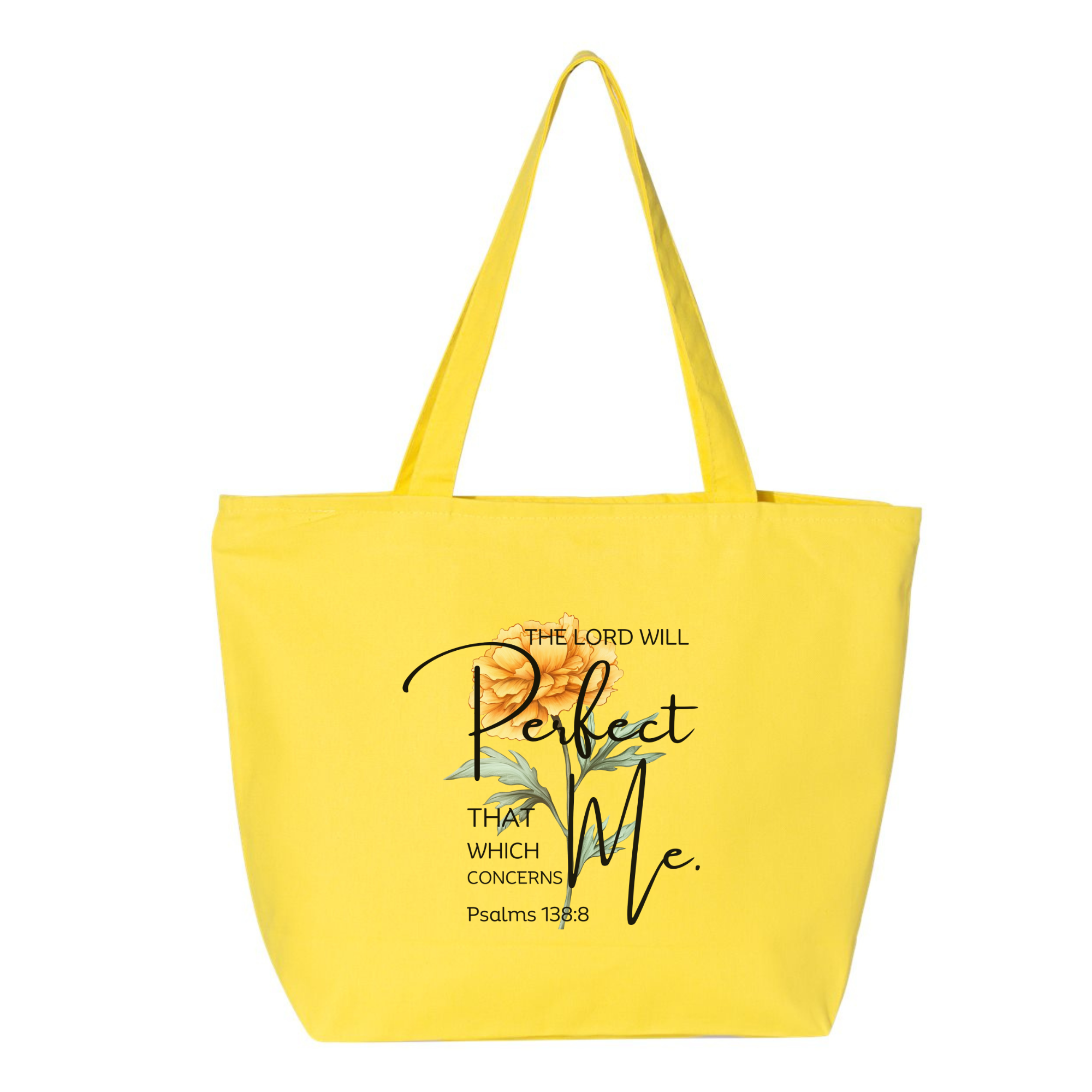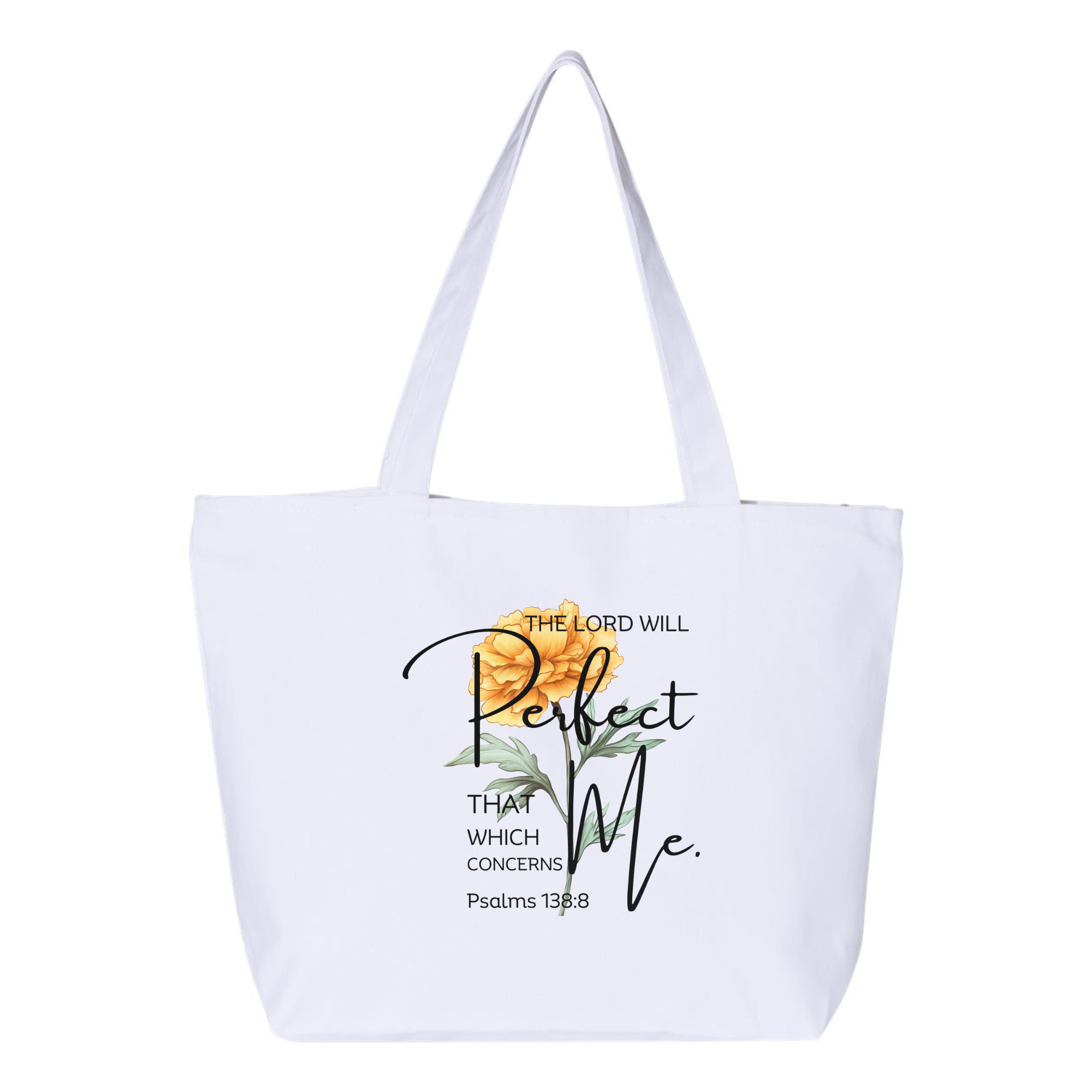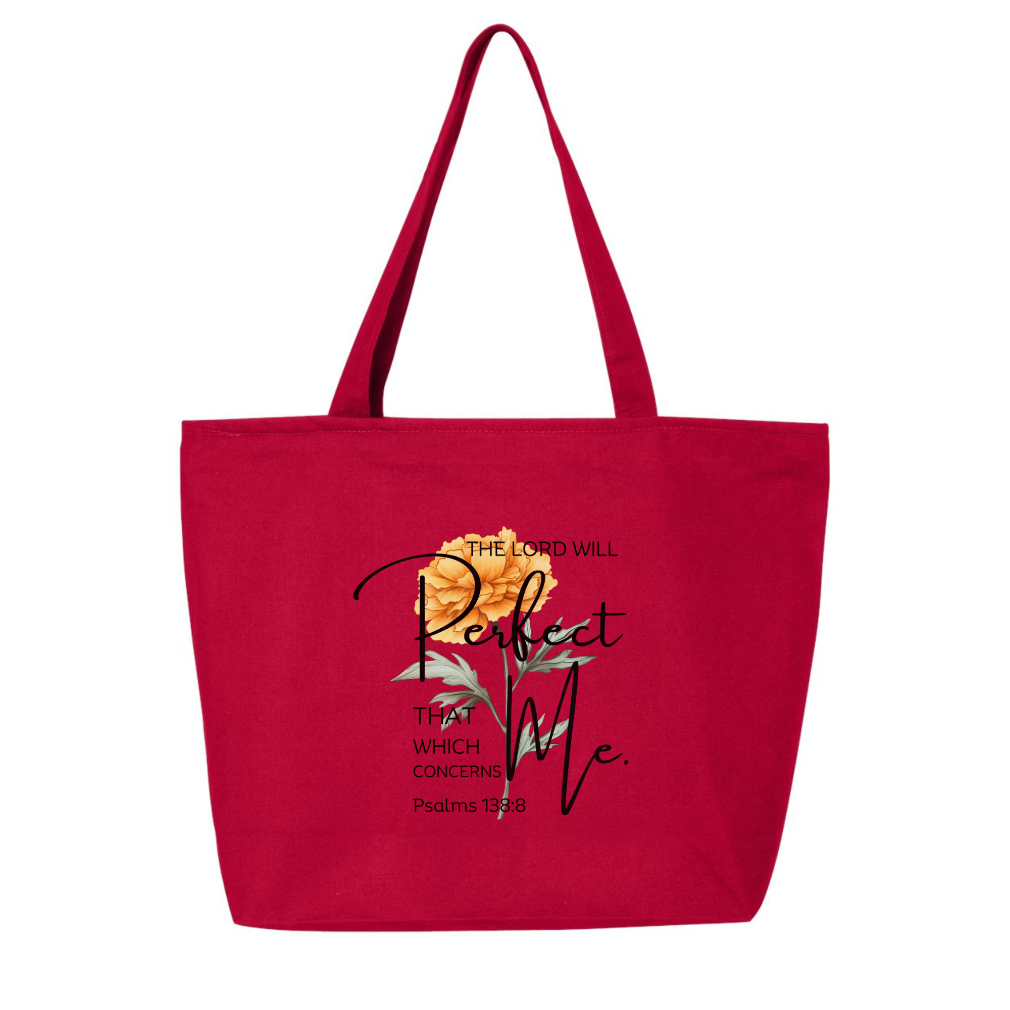 Trust in God's perfect plan with this elegant Christian tote bag featuring Psalms 138:8: "The Lord will perfect that which concerns me." Adorned with a beautiful watercolor floral design, this inspirational Scripture bag combines faith and fashion for everyday use.