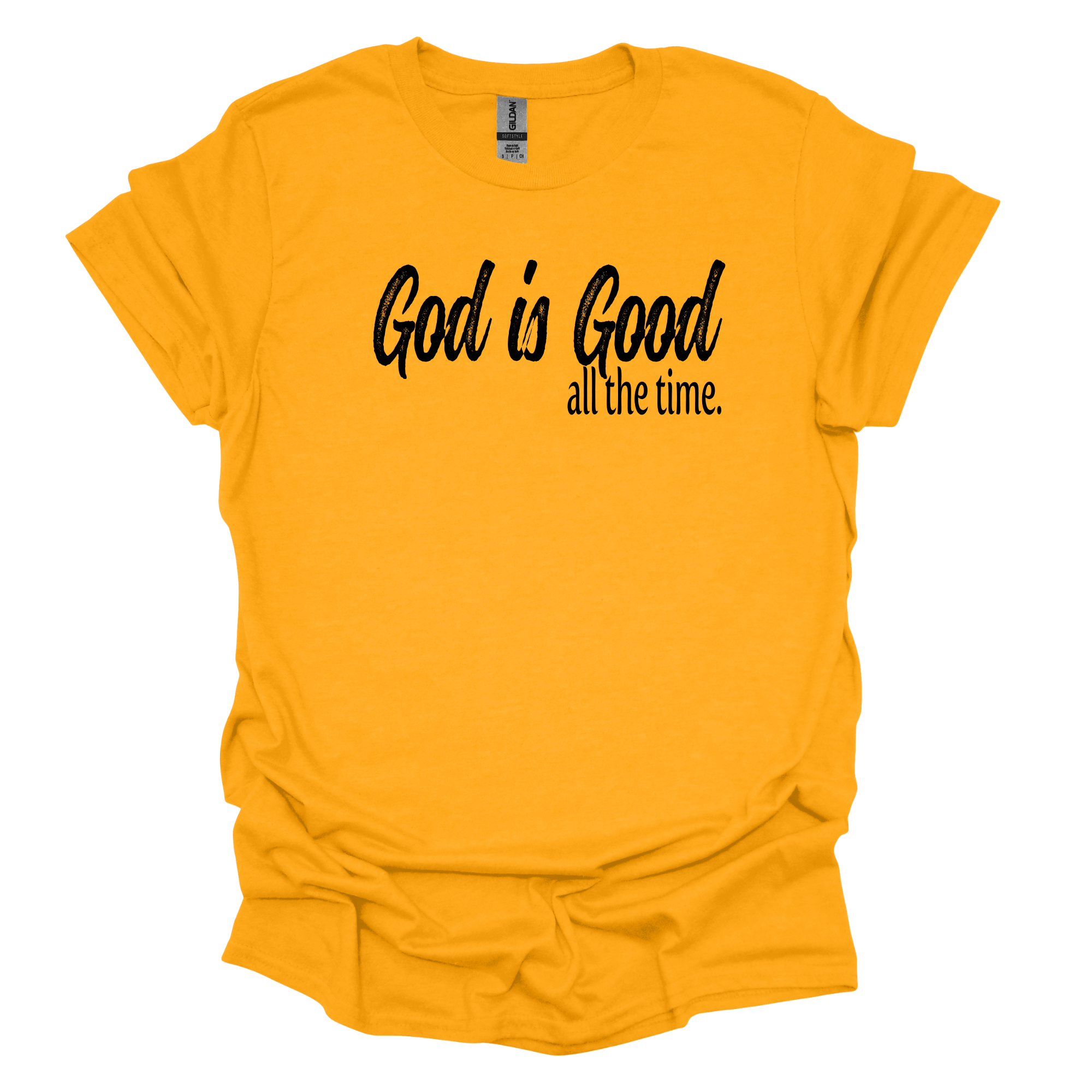 Celebrate God's unwavering goodness with this beautifully designed Christian t-shirt featuring the timeless declaration "God is Good all the time." This faith-based statement piece serves as a powerful reminder of God's constant faithfulness and perfect character, no matter what circumstances you face.