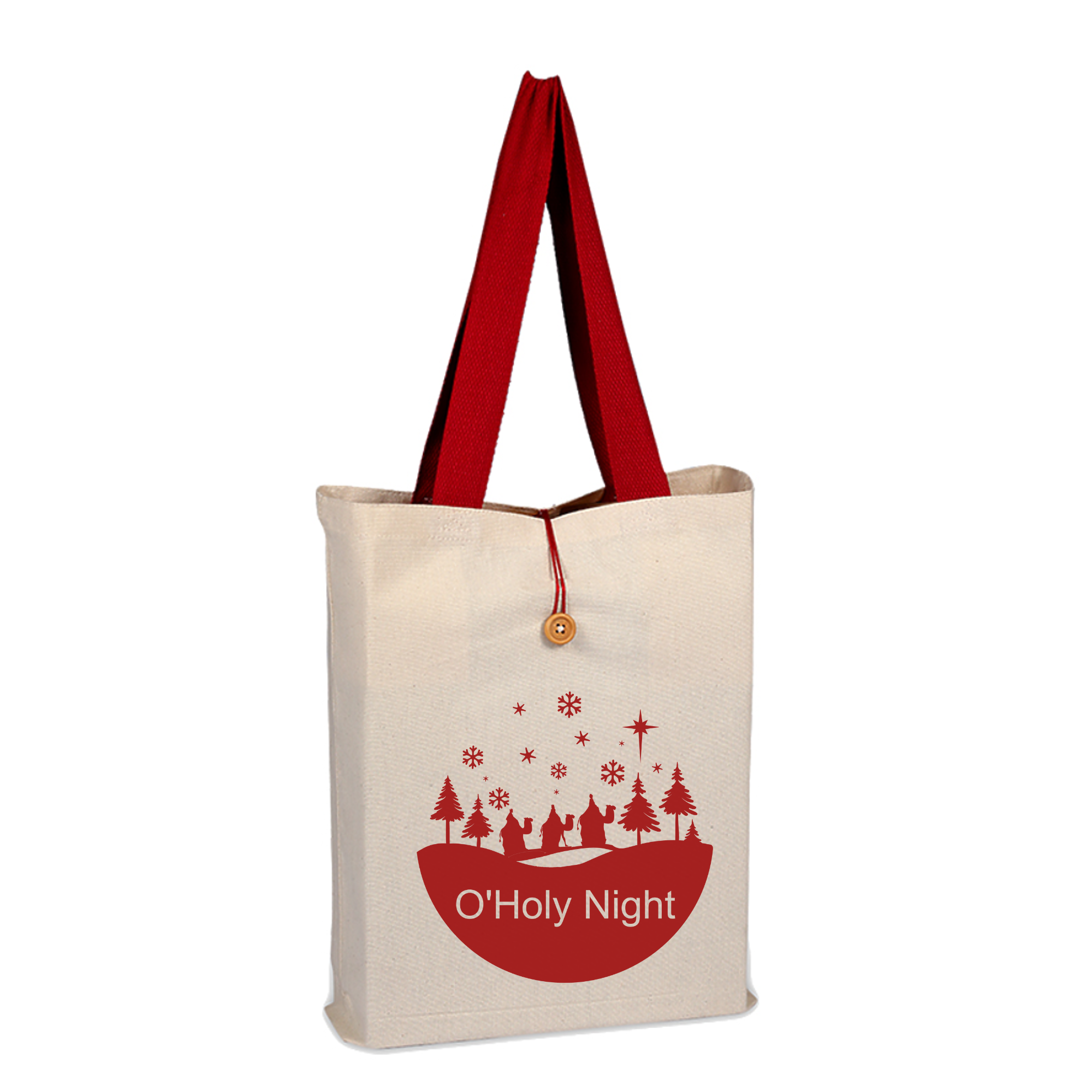 Choose between two elegant colors: classic red handles with red printing for a traditional Christmas look, or sophisticated black handles with black printing for a modern twist. Both options feature the same heartwarming "O'Holy Night" design on a natural beige canvas background, complete with a charming wooden button closure detail.
