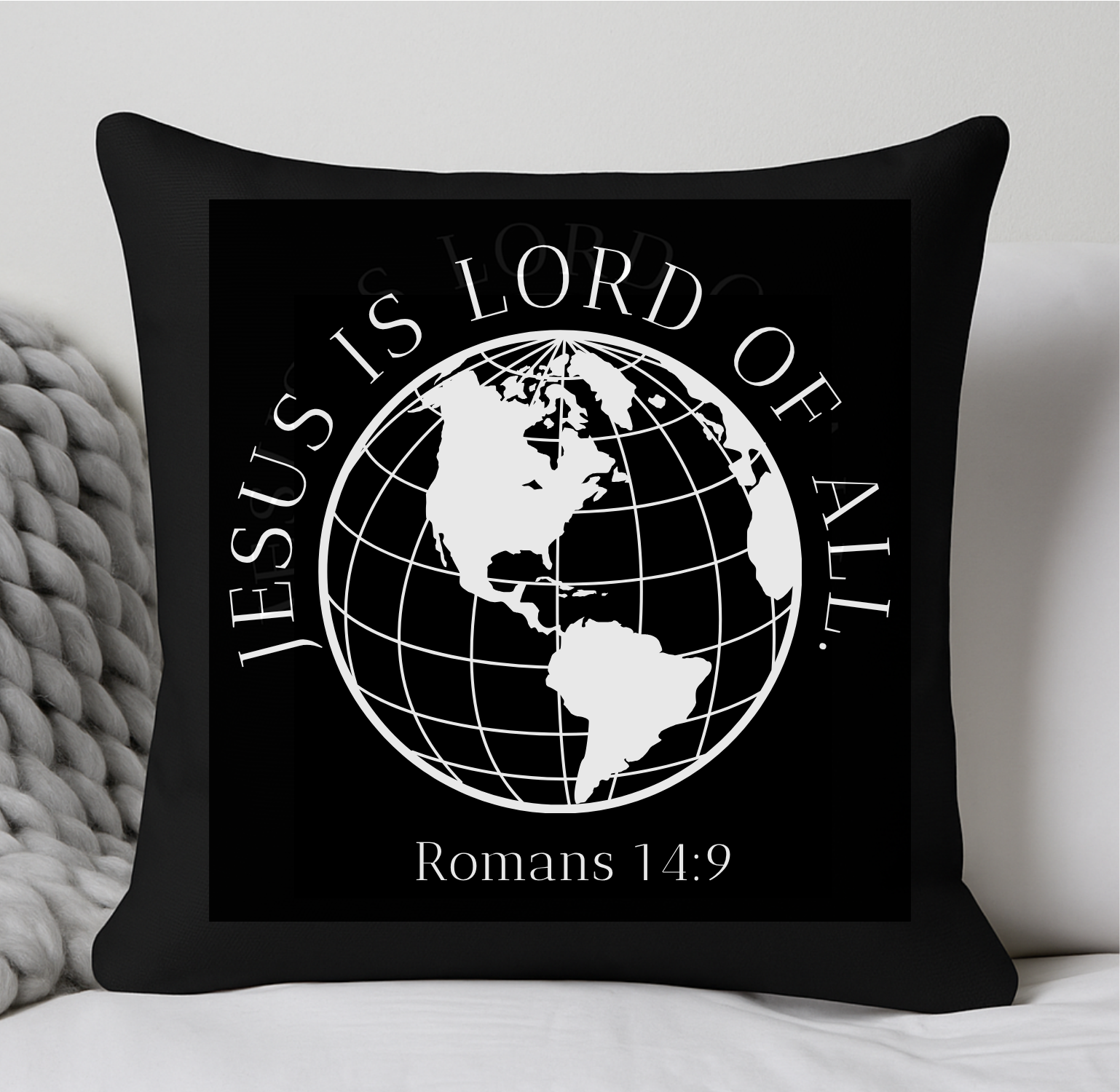 Transform your living space into a sanctuary of faith with our "Jesus Is Lord Of All" throw pillow. This stunning 18" x 18" accent pillow features a bold globe design with Romans 14:9, creating a powerful statement piece that proclaims Christ's sovereignty throughout your home.