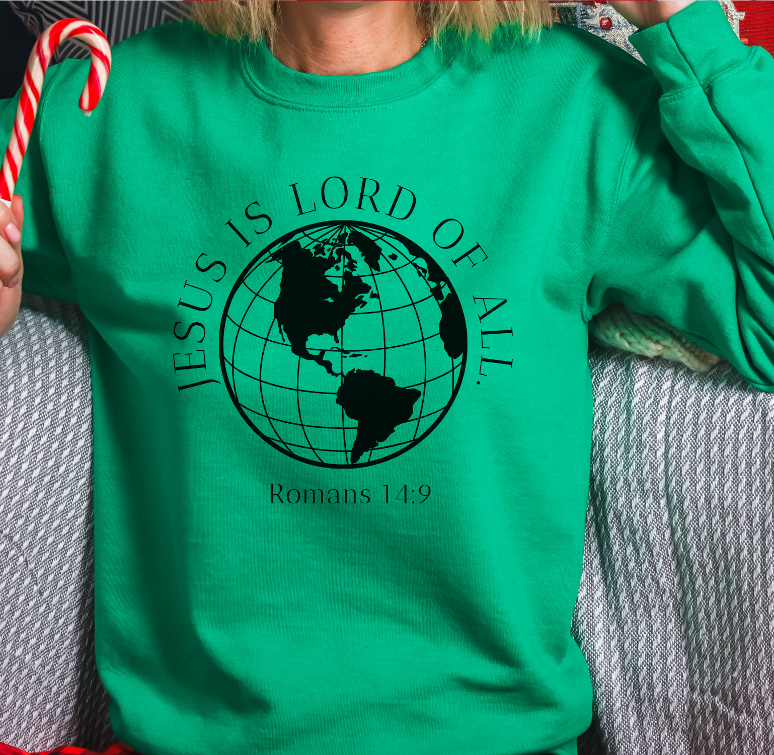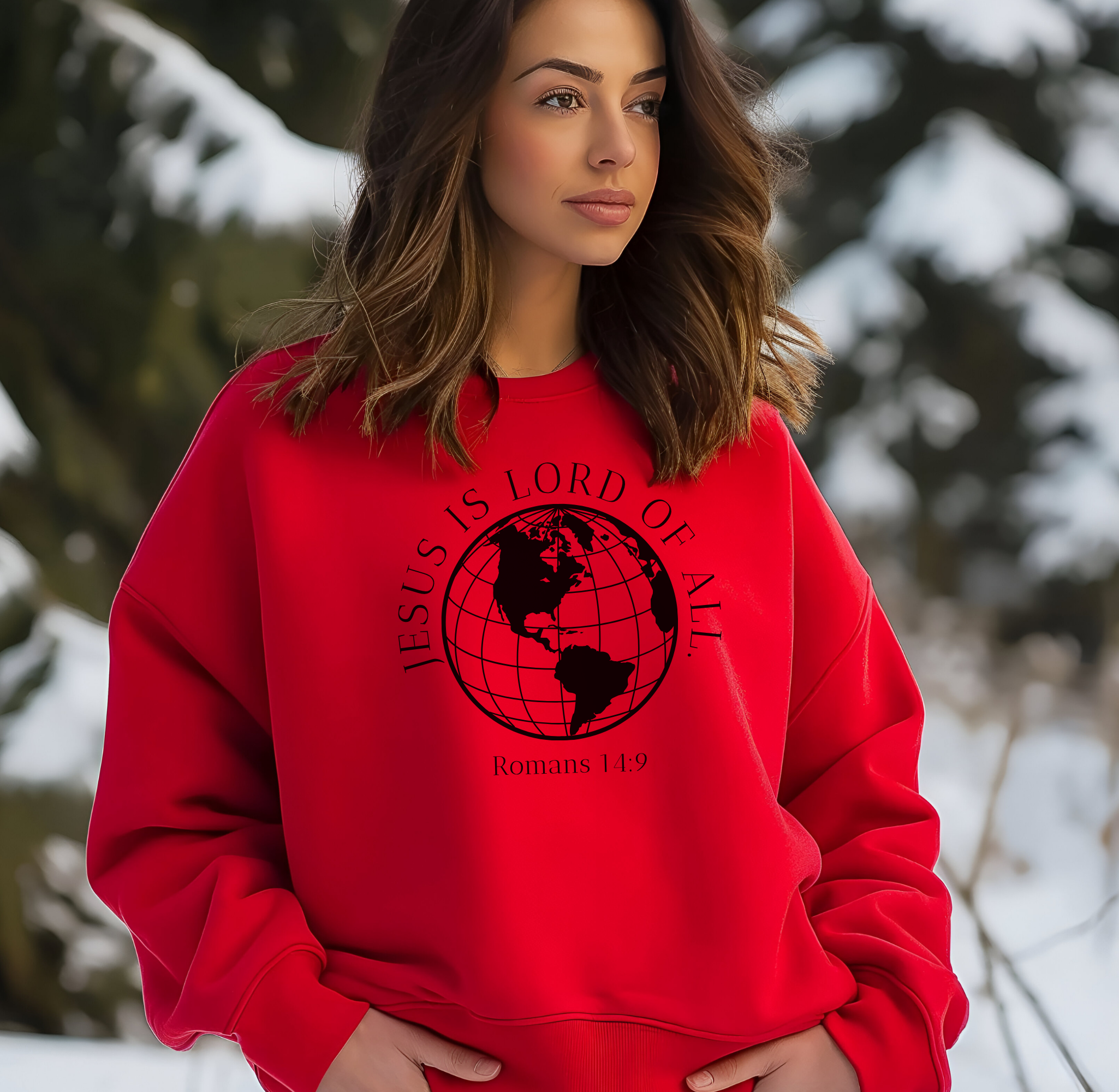 Declare your faith boldly with our "Jesus Is Lord Of All" crewneck sweatshirt. This powerful Christian apparel features a striking globe design with Romans 14:9 scripture, reminding us that Christ's lordship extends over every nation and all creation.