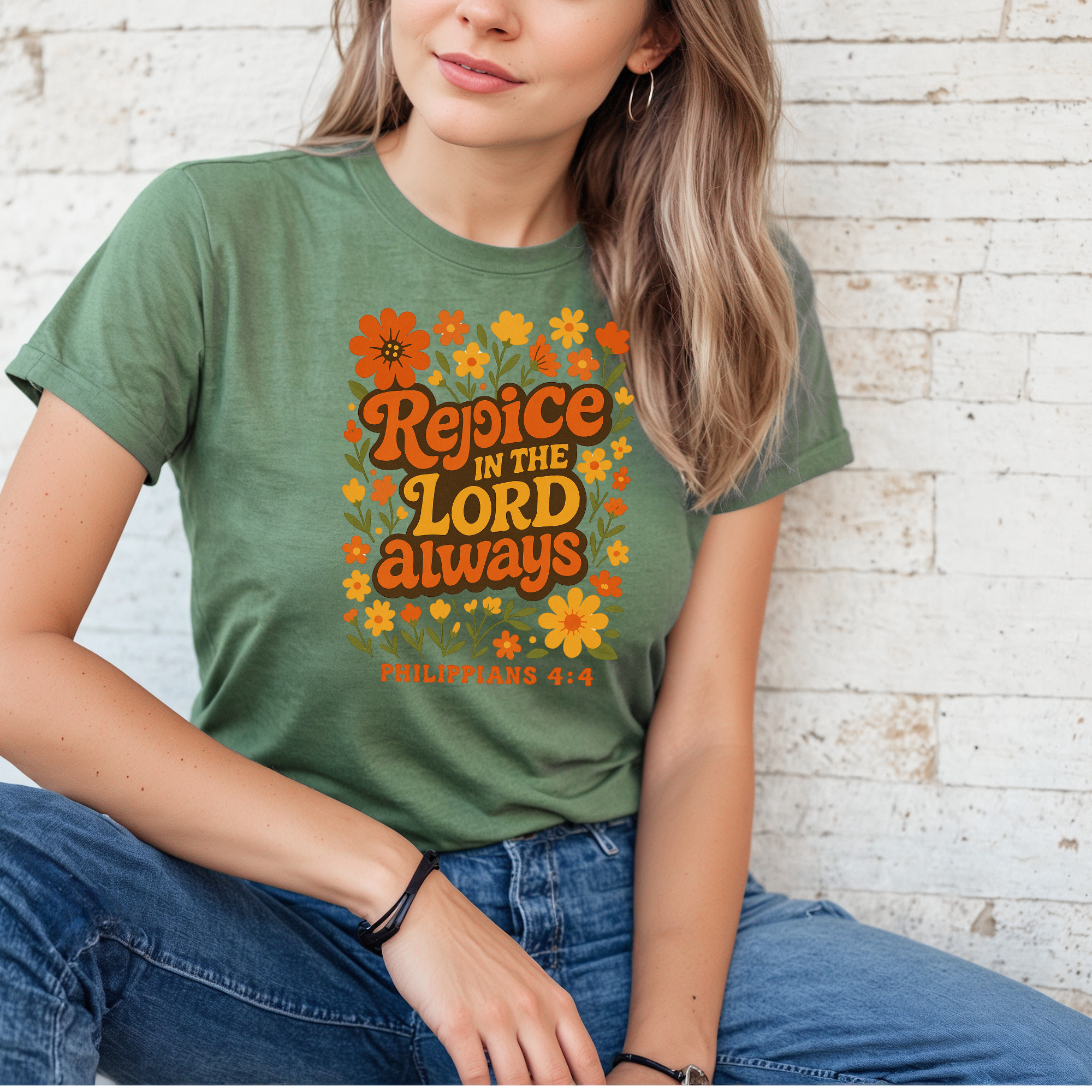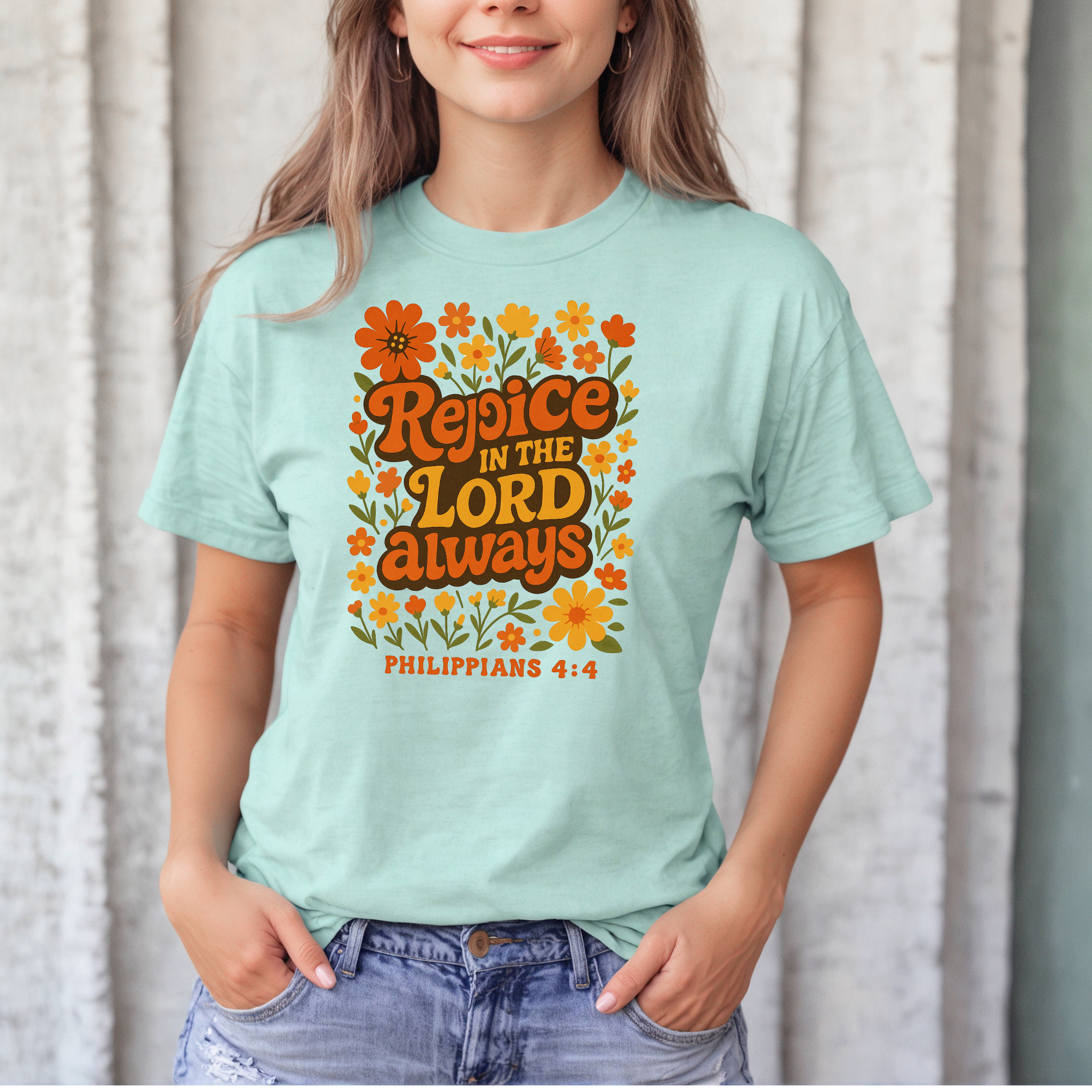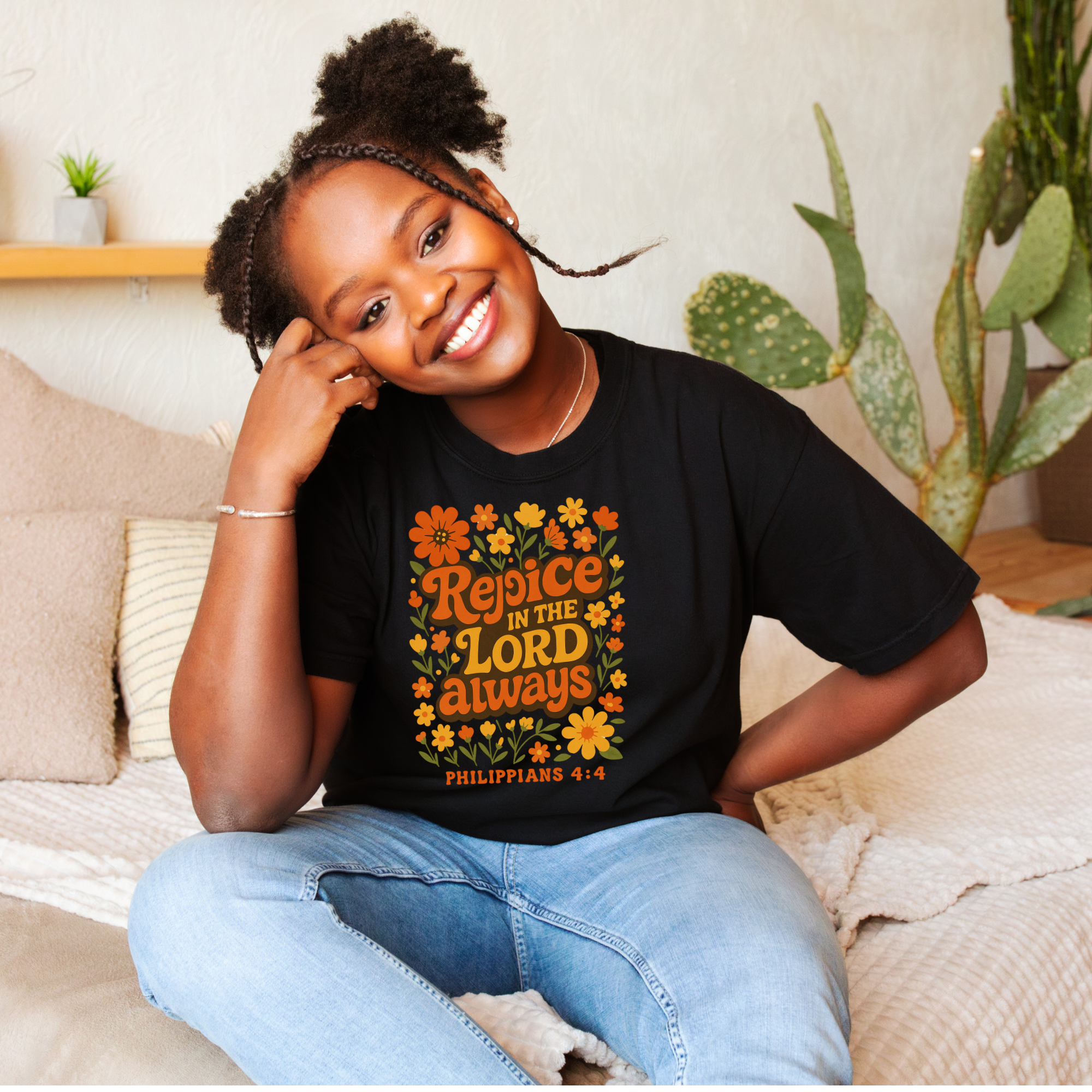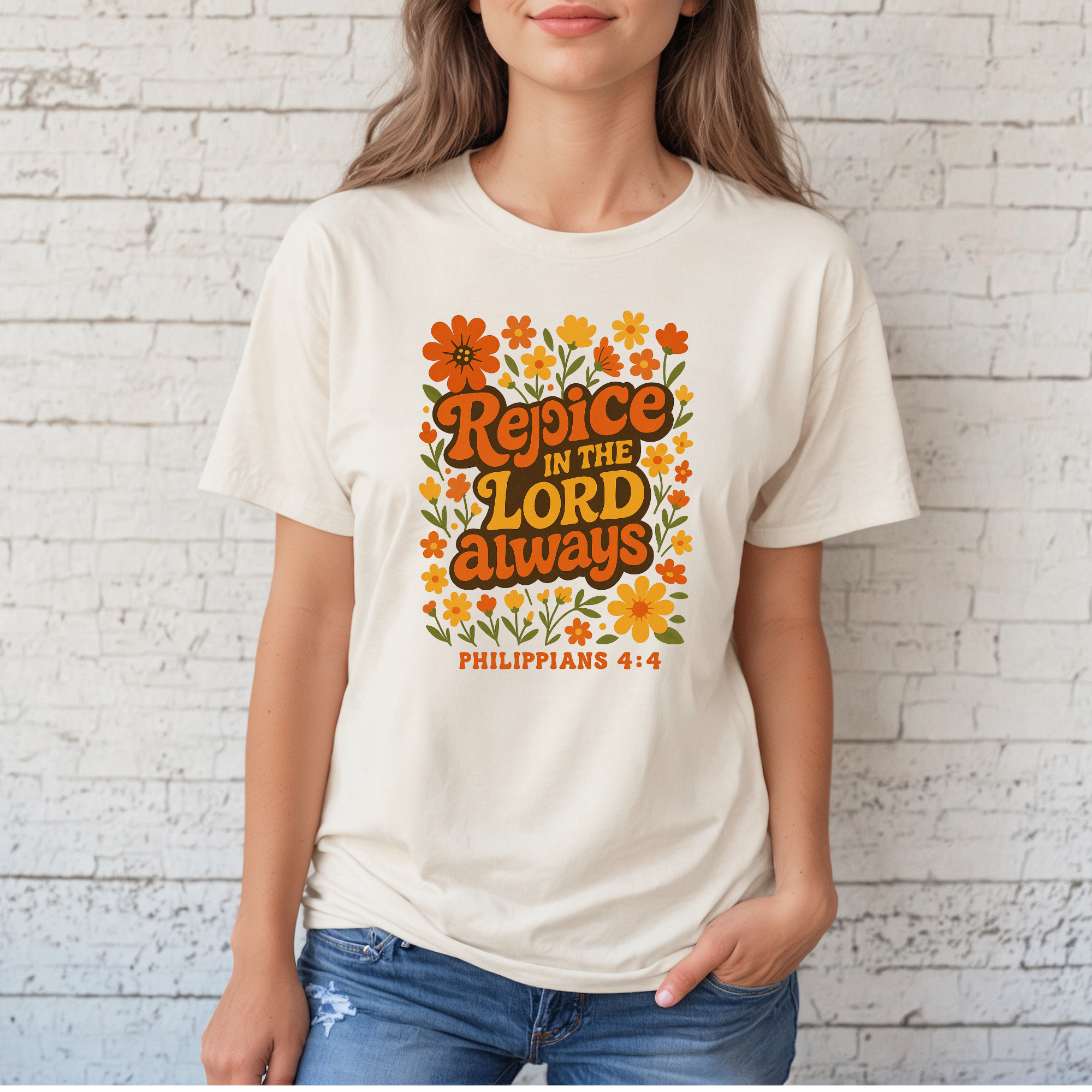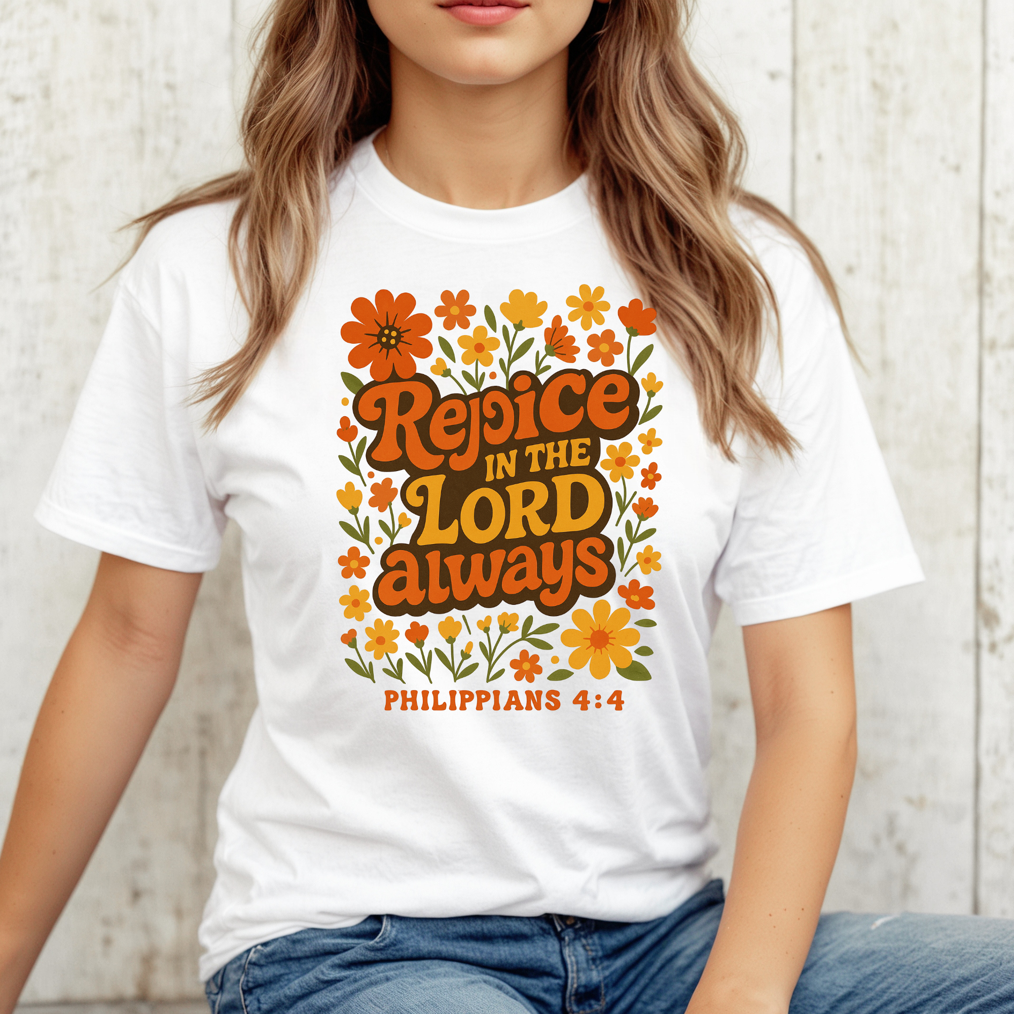 Wear your faith with joy in this uplifting "Rejoice in the Lord Always" t-shirt that combines scripture with stunning retro floral design. Featuring the beloved Philippians 4:4 verse in warm orange and golden yellow tones, this Christian shirt is your daily reminder to find joy in every circumstance.